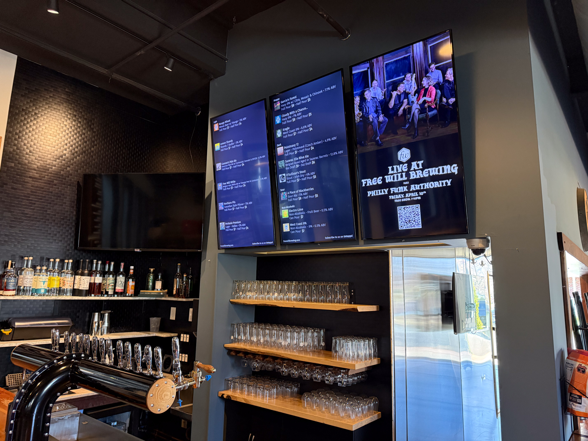 Free Will is one of those spots that strikes a nice balance between polished and laid-back. It feels modern without being cold, and even when it’s busy, there’s usually enough room to find a spot and settle in. The space is elevated by custom ash tables crafted by the owner, adding a subtle, personal touch that sets it apart from your typical taproom.